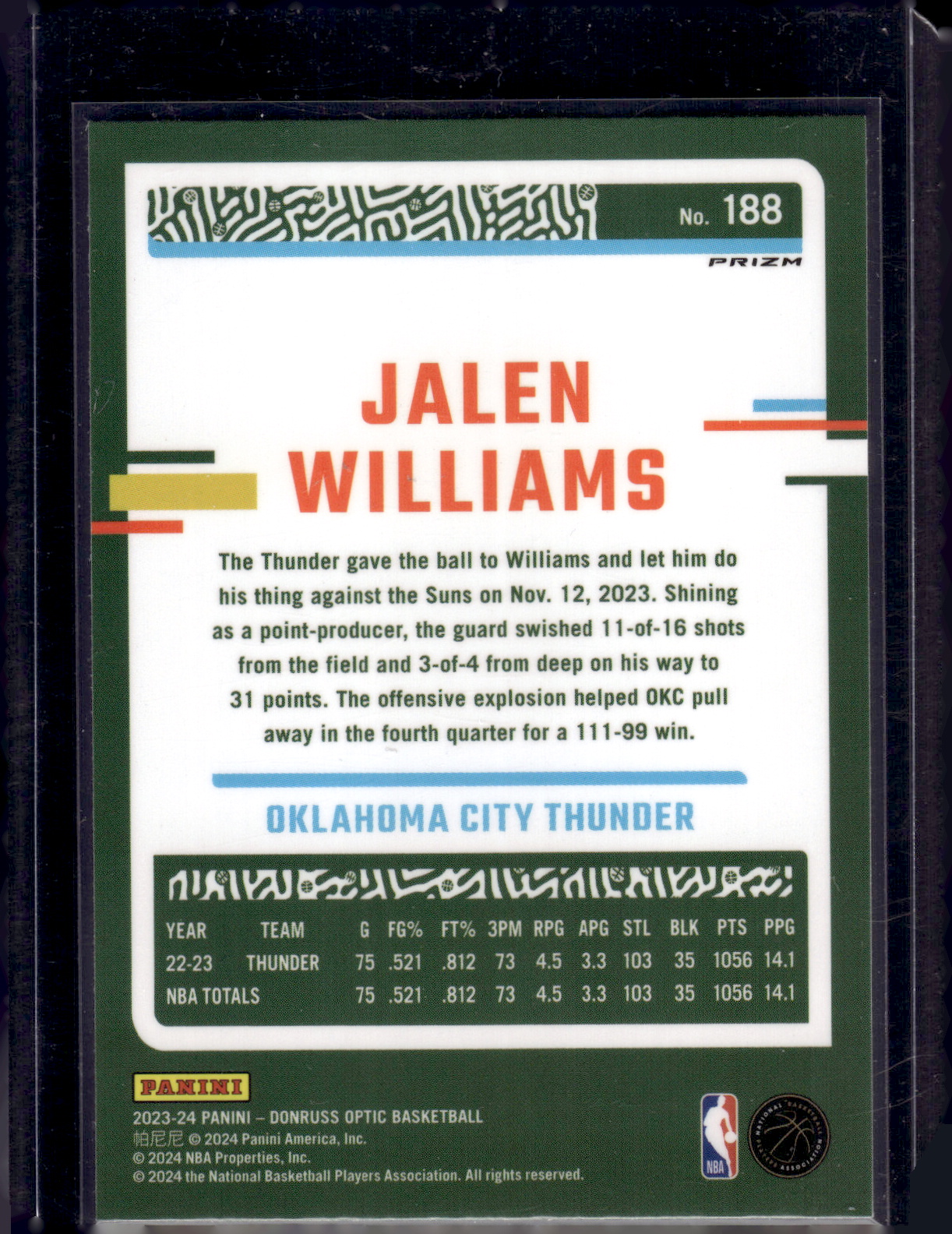 Jalen Williams Blue Velocity Prizm 2023-24 Donruss Optic #188 OKC Thunder