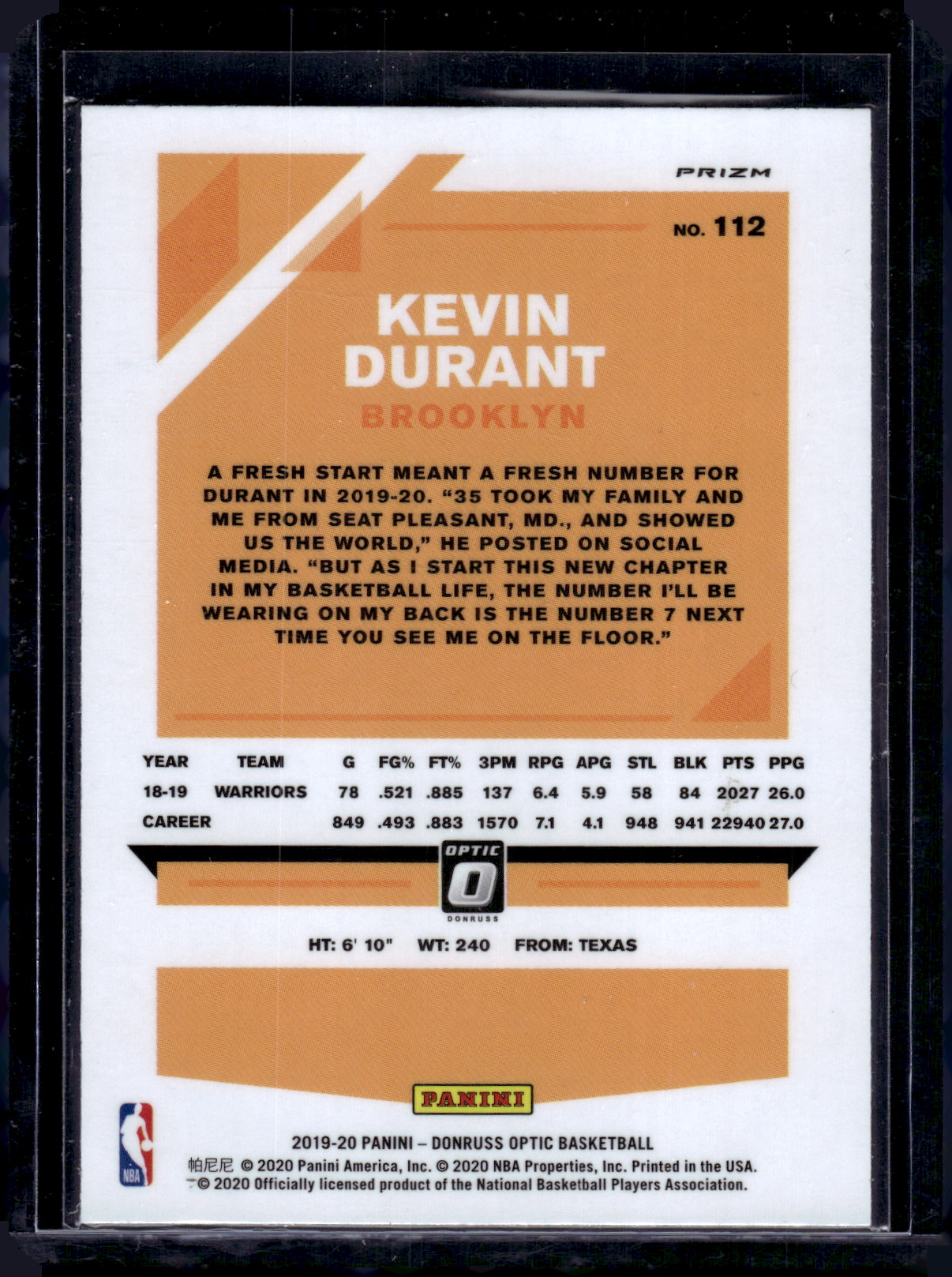 Kevin Durant Holo Prizm 2019-20 Donruss Optic #112 Nets, Rockets